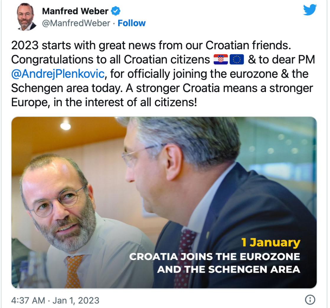 Dobrodošla Hrvatska u Eurozonu & Schengen. Danas Europa postaje sve snažnija i ujedinjenija. Čestitke Andreju Plenkoviću na provedbi reformi i usmjeravanju zemlje prema integraciji. Europski parlament vas pozdravlja otvorena srca, ushićeno je izjavio Predsjednik Kluba zastupnika EPP-a Manfred Weber .