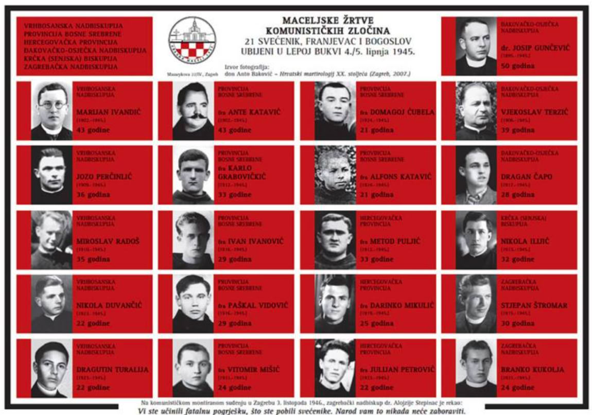 "In Eternal Memory of the Croatian Soldiers, Priests, Franciscans and All of the Croatian Martyrs Killed in May and June 1945 in the Macelj Forest near Krapina and the Camps in Mirkovac and Oroslavju." Fran Živičnjak lived alone in an apartment and died in a bathtub from an electric shock, perhaps the result of an UDBA attack.