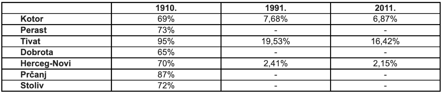 (Izvor: A. Pečarić - J. Pečarić, Hrvati u Boki kotorskoj u Kraljevini Jugoslaviji, Hrvati Boke kotorske /Zbornik Pomorskog muzeja Orebić: Posebno izdanje/, Orebić 2003., 172; Službeno izvješće Zavoda za statistiku Crne Gore, 8,
