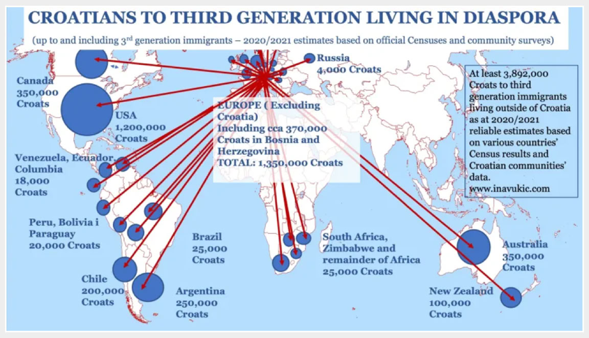 Iako prema posljednjem popisu stanovništva Hrvatska ima manje od četiri milijuna stanovnika, u stvarnosti se može pohvaliti s čak 8 milijuna ljudi Hrvatskih korijena i interesa ako se uračunaju sve hrvatske dijaspore iz cijeloga svijeta. Ako izuzmemo Hrvate u Bosni i Hercegovini i Hrvatske manjine u susjednim državama, činjenice govore da na raznim svjetskim meridijanima i paralelama živi više od 4 milijuna hrvatskih iseljenika i njihovih potomaka. Među najvećim brojem Hrvata i onih hrvatskog podrijetla koji žive u dijaspori su oni u SAD-u, Kanadi, Australiji, Čileu, Argentini i Njemačkoj.