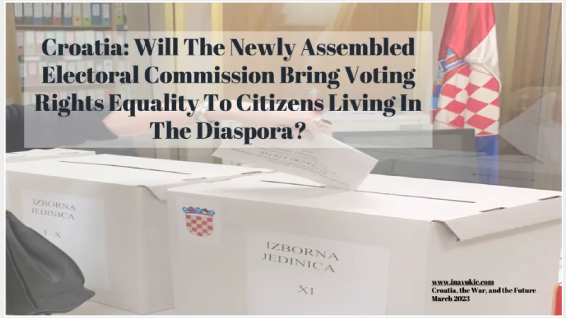 As far as the Electorate 11 is concerned, for the diaspora and Croatian citizen voters residing outside of Croatia, let’s hope that the new make-up of the Electoral Commission will follow the footsteps of the Constitutional Court and revisit the voter and representation formula as the Constitutional Court did for the Electorates in Croatia proper. The access to voting booths within the Electorate 11 has been painfully biased and downright discriminatory. That is, in the Bosnia and Herzegovina part of the Electorate 11 voting booths or polling places were many, scattered fairly across the territory, accessible to all voters. In the rest of the Electoral 11 – Canada, USA, Australia, UK, Germany, Austria etc. – polling booths were limited to Embassy or consular Headquarters!