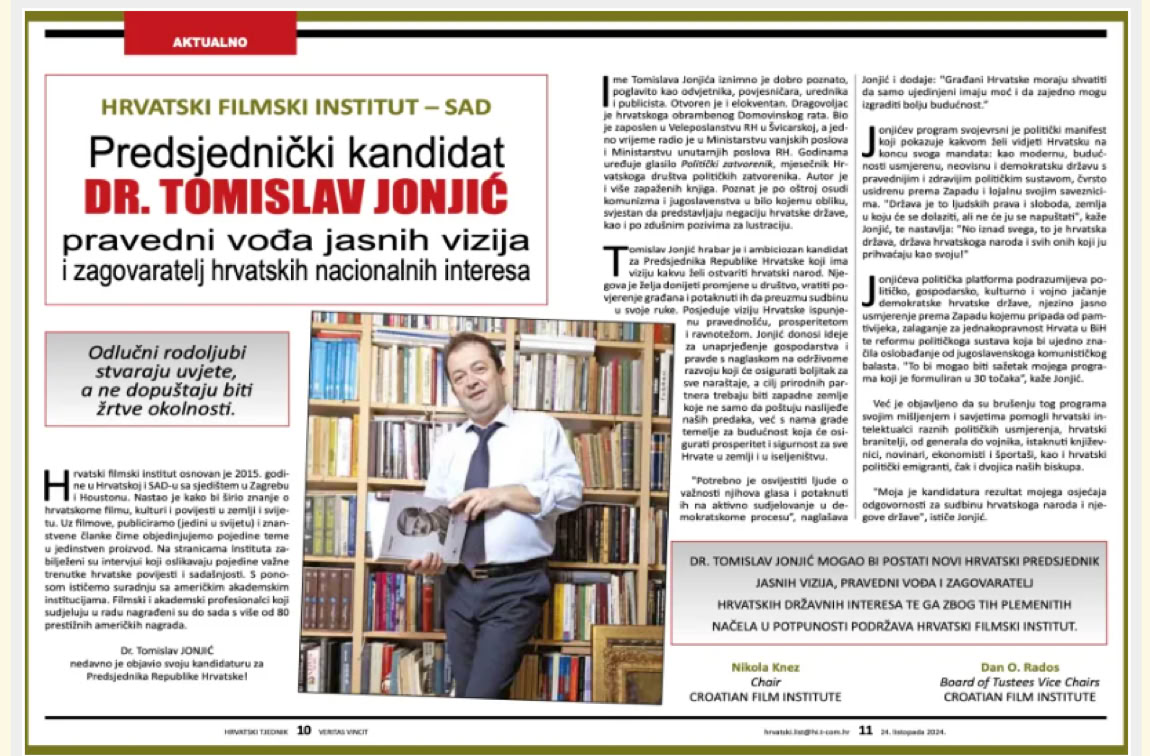 The Croatian Film Institute – USA, led by Nikola Knez, recently stated that Presidential candidate Dr. Tomislav Jonjic is a just leader with clear visions and an advocate for Croatian national interests. This statement was published in the Croatian Weekly Hrvatski tjednik on October 24, 2024, and I am translating it here into English so that as many people around the world as possible can become aware of it, especially citizens of the Republic of Croatia who have the right to vote in the elections that will be held on December 29 of this year. It is a short to the point presentation of the politician that Jonjic is.