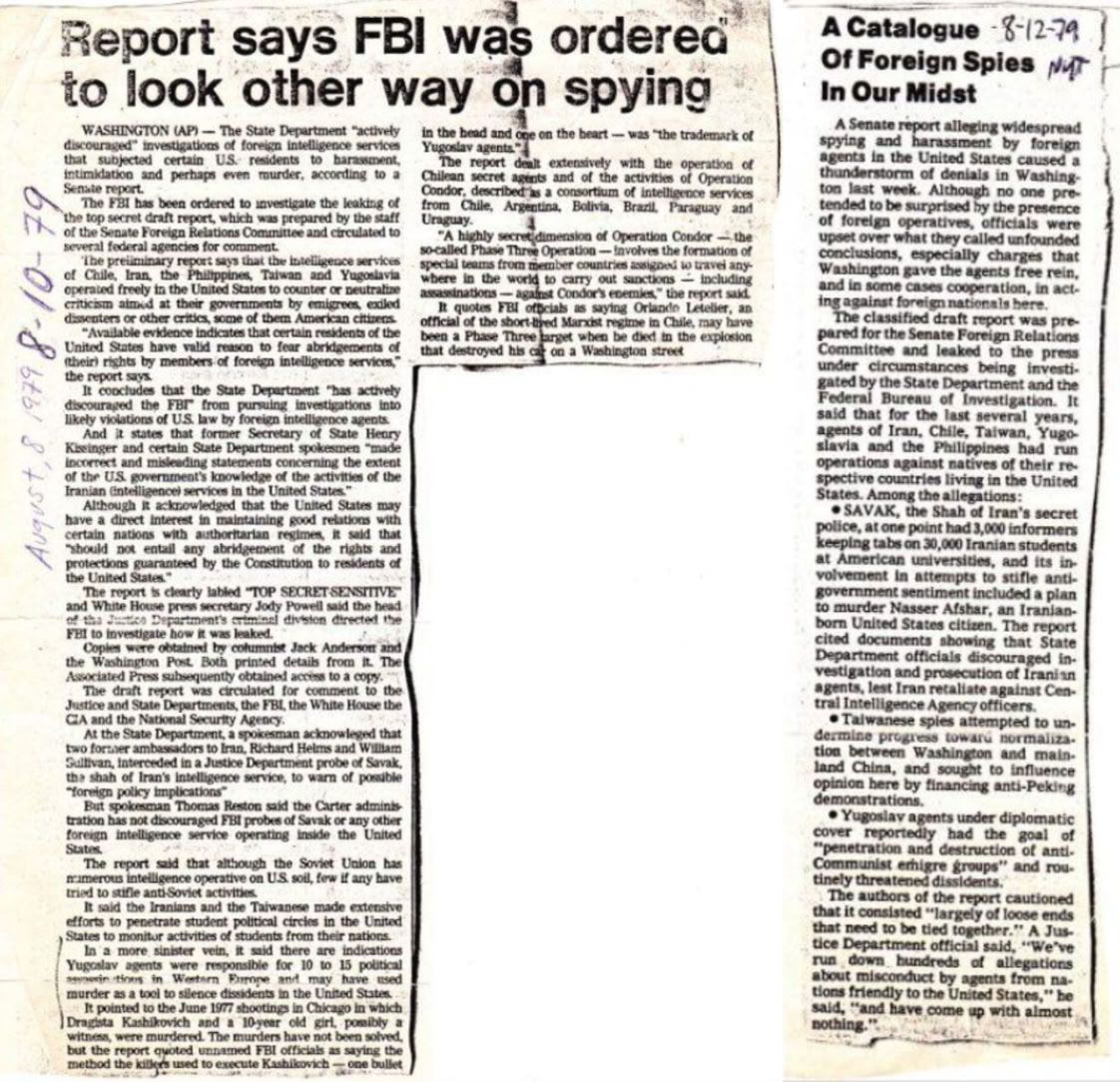 In addition, Yugoslav intelligence services were active against Croatian dissidents in the diaspora, often in collaboration with U.S. intelligence services. This collaboration was openly described in the mainstream media in 1979, after a U.S. Senate report on the subject was leaked. The New York Times wrote that the State Department “actively discouraged” investigations by foreign intelligence services that harassed, intimidated, and even possibly killed certain American citizens. The report, in a darker tone, states that there are “indications that Yugoslav agents are responsible for 10 to 15 political assassinations in Western Europe and that they may have used the killings as a tool to silence dissidents in the United States.”