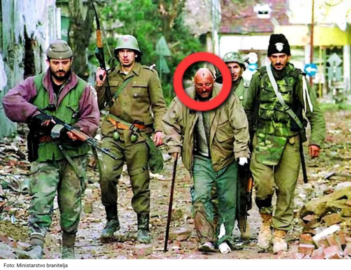 The photograph of Slavko Batik, taken on November 16, 1991 on Proleterska Street in the Sajmište district of Vukovar, has been seen around the world. It shows five people walking down a destroyed street. The stance, face and appearance of the hunched Batik, who walks leaning on a cane while four Serbian JNA and Chetnik soldiers surround him, faithfully depicts all the suffering that the people of Vukovar faced. He looks tortured and exhausted. Scars, bruises and redness are visible on his face, his arm and leg are bandaged. His hair is thin from burns. His trousers are dirty and muddy. He was only 48 years old.