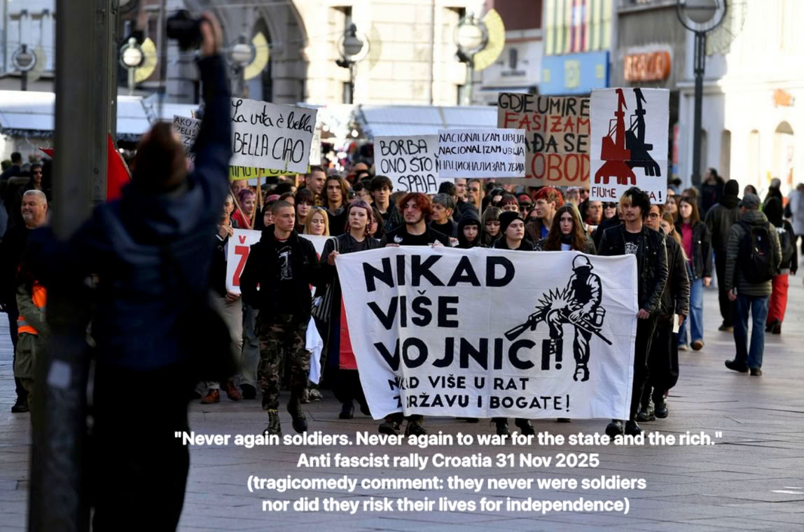 Former communists and their loyal followers were never going to take the defeat lightly; their persistent hatred of that Croatian Homeland War victory, their persistent amassing of lies against Croatian independence and those who fought for it culminated on Sunday 31 November 2025 in a series of “anti-fascists against fascists” rallies in four cities in Croatia. A similar show for the world Tito staged in 1948. The rallies had nothing to do with anti-fascism or fascism, because neither exist in earnest in Croatia, but had everything to do with attempts to crush the independent state of Croatia, glorifying the former Yugoslavia. Multitudes of flags of former Yugoslavia at the rallies!