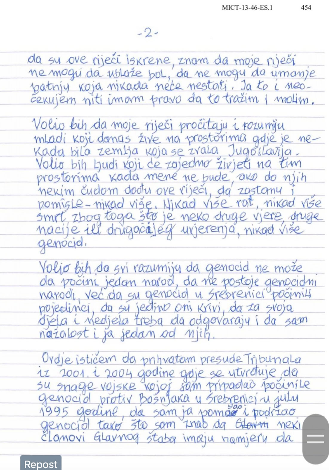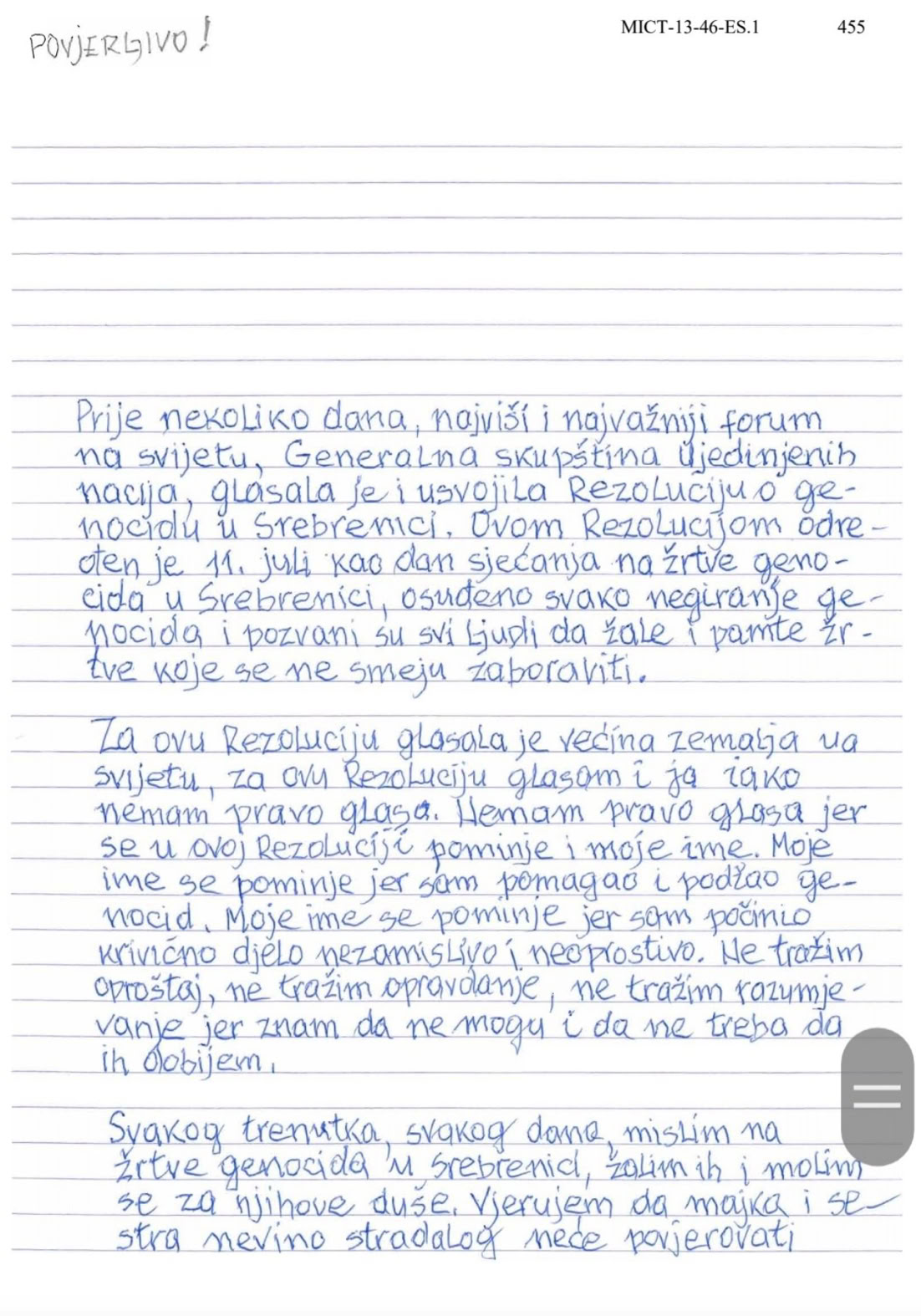 To je pismo Krstić MICT-u uputio 18. lipnja, a iz njega proistječe kako ga je izravno potaknula rezolucija o osudi genocida u Srebrenici, koju je u svibnju usvojila Opća skupština UN, a u tom je dokumentu spomenuto i njegovo ime među onima koji su odgovorni za ubojstvo tisuća bošnjačkih muškaraca i dječaka. Krstić je sudu napisao kako bi i sam glasao za tu rezoluciju da je imao pravo glasa. "Moje ime se spominje jer sam pomagao i podržavao genocid, moje ime se spominje jer sam ja počinio nezamisliv i neoprostiv zločin", stoji u pismu Krstića, koji je 1995. bio zapovjednikom zločinačkog Drinskog korpusa vojske bosanskih Srba čiji su pripadnici izravno sudjelovali u ubijanju zarobljenih Srebreničana.